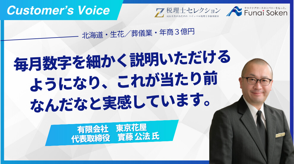 これまでは、月次の数値報告をしていただく打合せなどはありませんでしたが、新しい税理士に変更してからは、毎月数字を細かく説明いただけるようになり、これが当たり前なんだなと実感しています。
