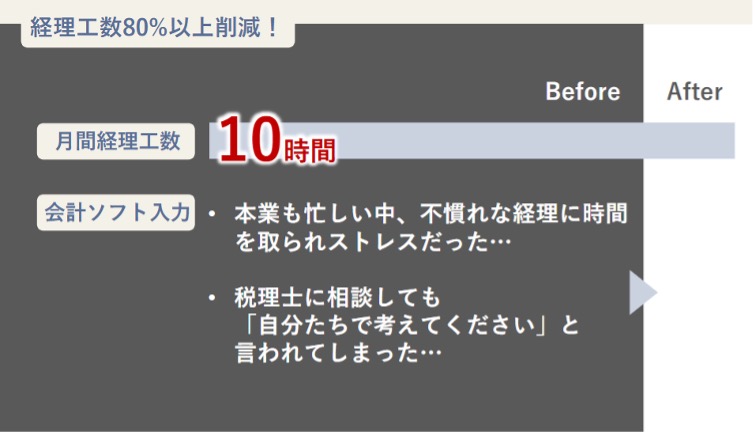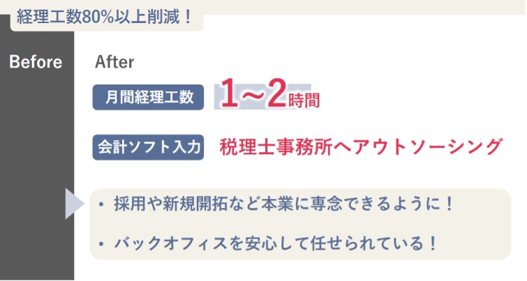 税理士変更後は、経理にかかる時間が月1〜2時間程度と、80%以上削減できました。会計入力や仕訳は全て税理士に代行してもらえるようになりました。