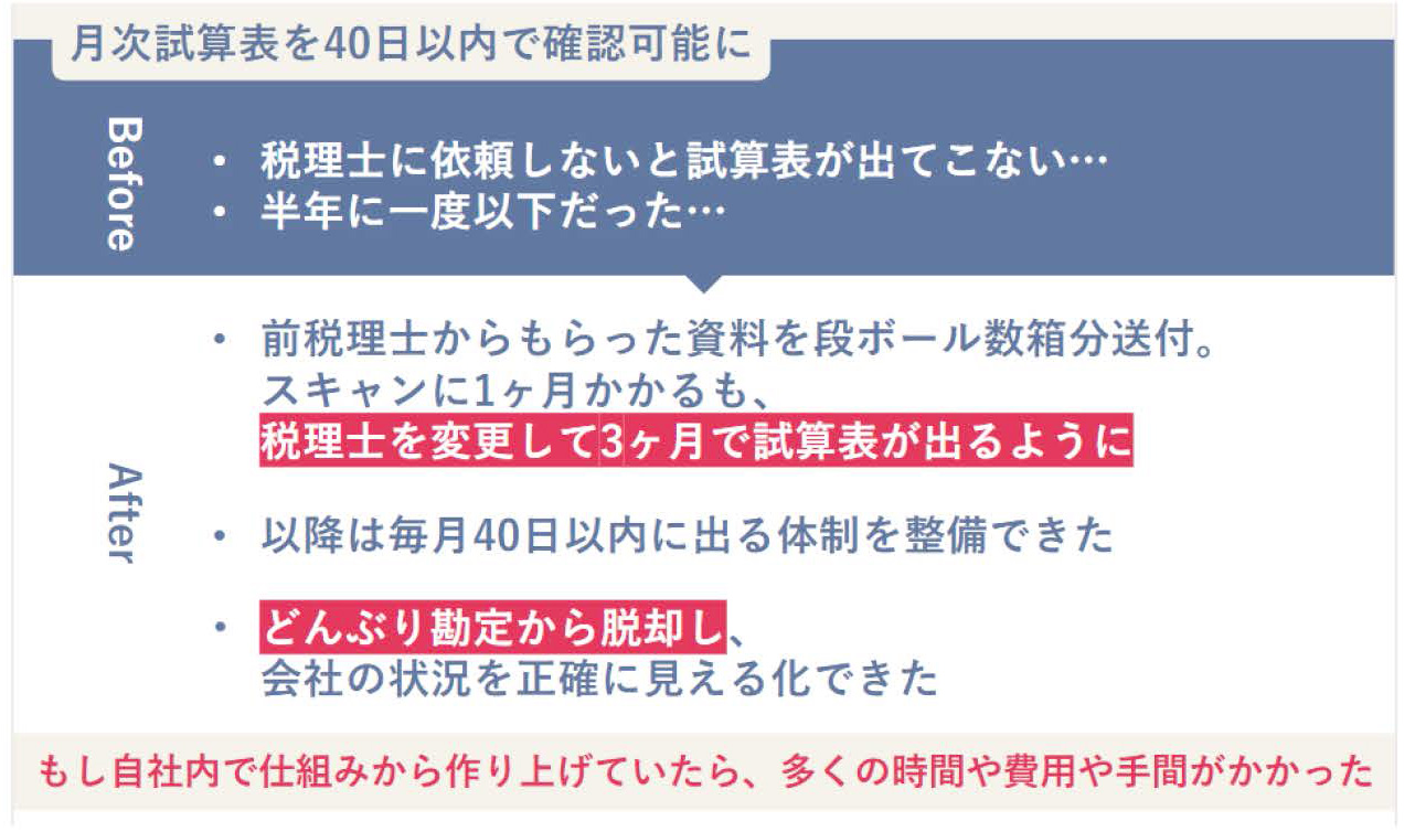 税理士変更後は、クラウド会計を導入してもらい、会計入力は税理士事務所にアウトソーシング(記帳代行)をすることで、月次試算表が毎月40日以内に手元に届くようになりました。