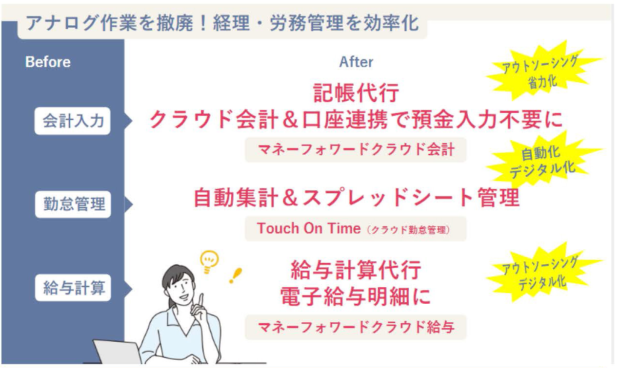クラウド会計やクラウド勤怠、給与システムの導入で、アナログ作業は撤廃され、事務担当者の残業も解消されました。