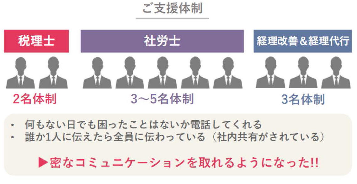 また、税理士と同時に、グループ内の社労士も変更した所、ワンストップで相談できるようになりました。