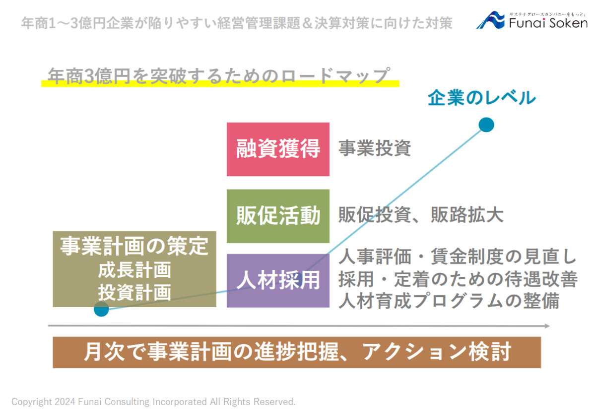 年商3億円突破に向けたロードマップとして「人事評価・賃金制度の見直し」や「人材育成プログラムの整備」が挙げられています。