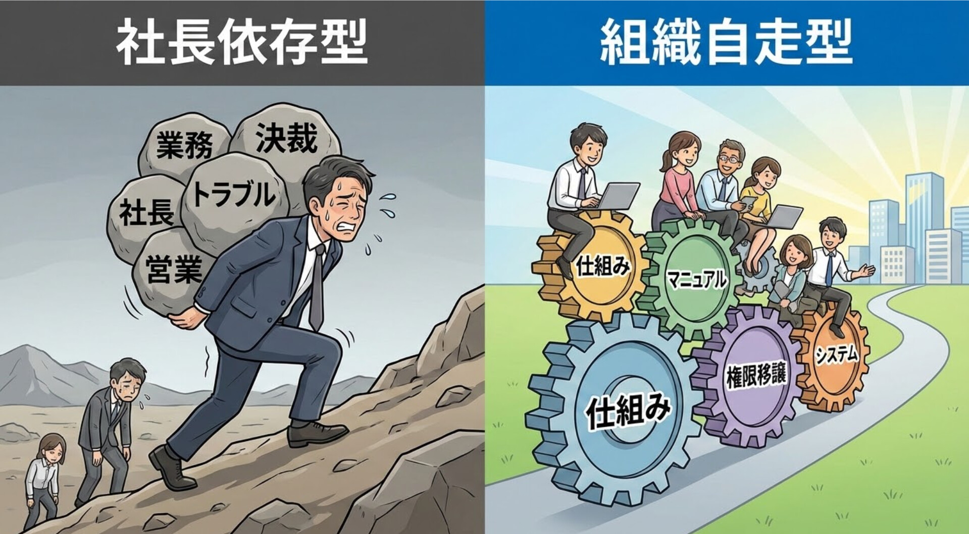 社長のマンパワーに依存している企業は、裏を返せば「社員に任せられる仕組みがない」状態です。