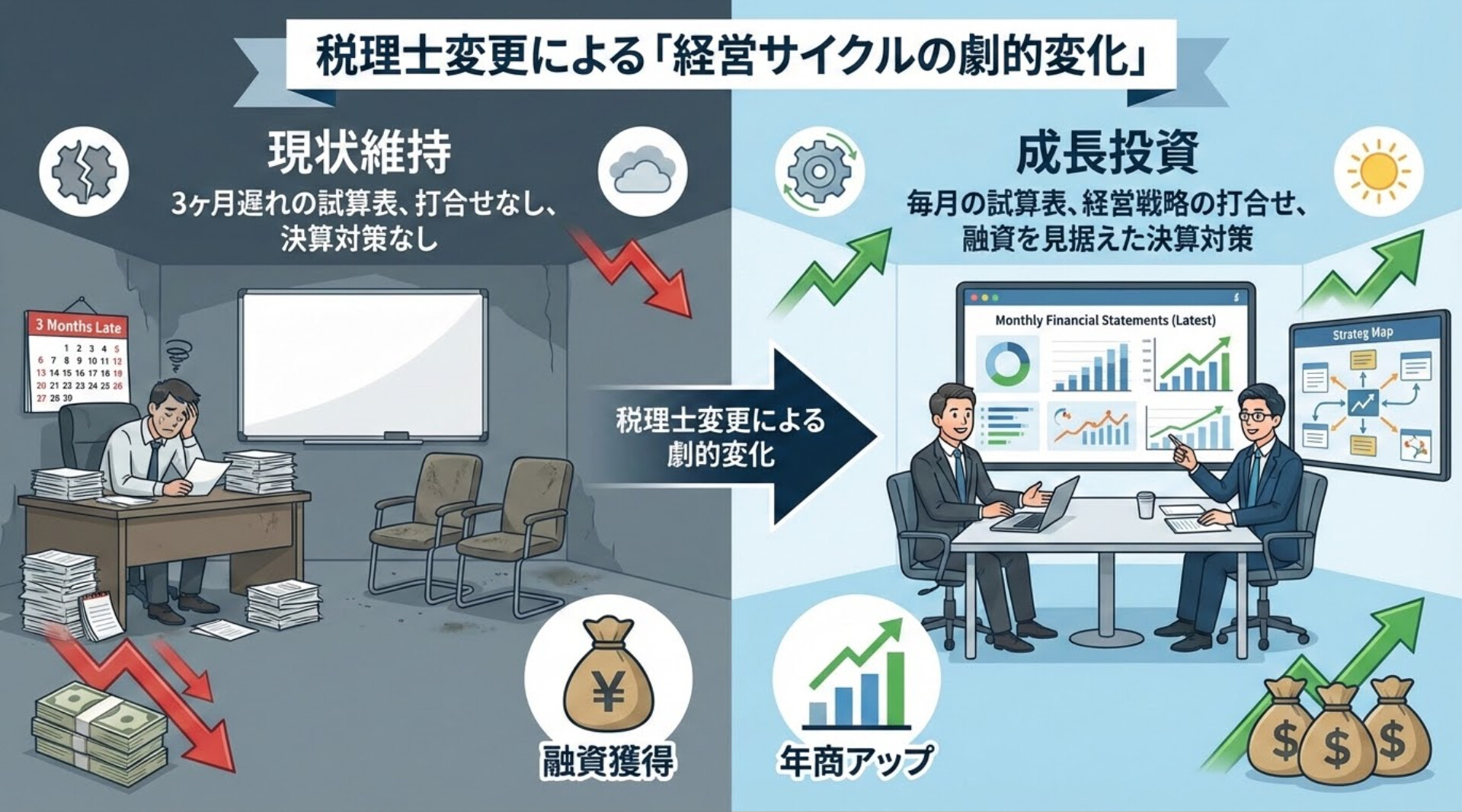 実際に、成長支援に強い税理士へ変更したことで月次決算が早期化し、銀行からの評価が向上しました。