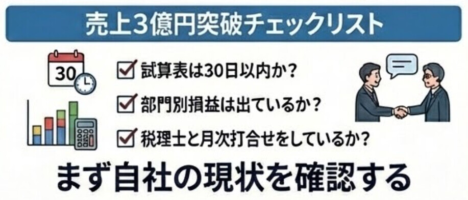 年商3億円という数字は、中小企業が「個人商店の延長」から「組織的な企業」へと脱皮するための最初の大きな試練と言えます。
