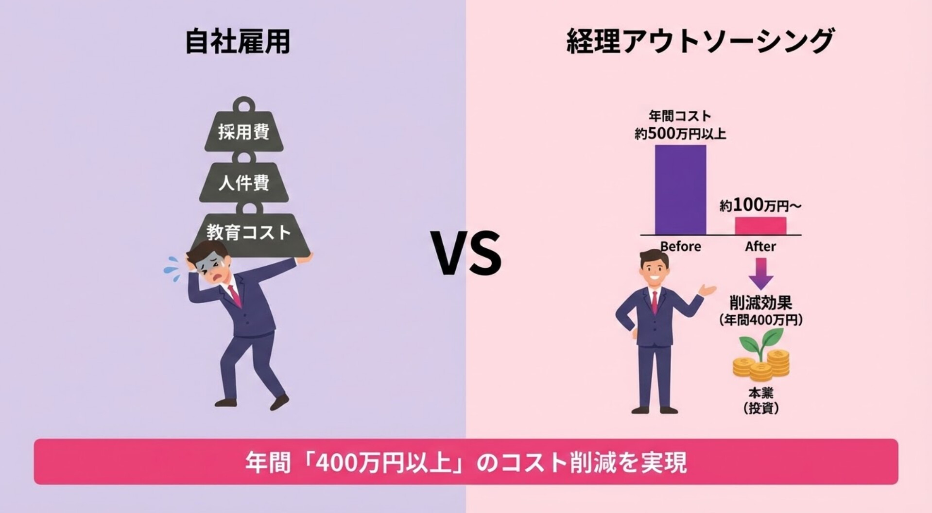 これに対し、記帳代行を含むアウトソーシングを活用すれば、採用・人件費コストを劇的に削減(年間400万円以上の削減事例あり)できるだけでなく、プロによる高品質な業務遂行が可能となります。