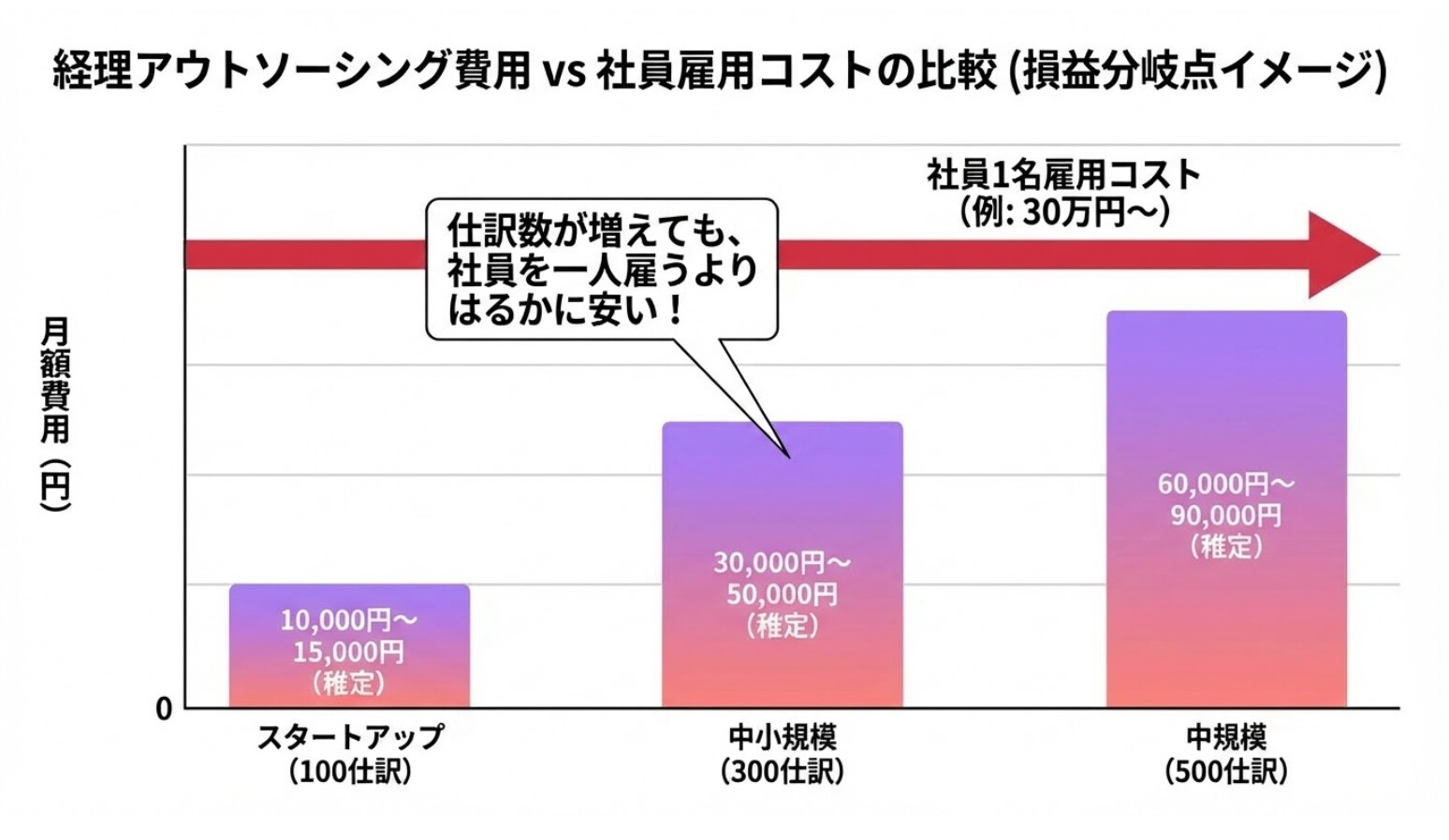 ※仕訳数がこれ以上増える場合や、複雑な部門別管理が必要な場合は、1時間あたり4,000円〜などの「タイムチャージ制」や、ボリュームディスカウントのある「月額固定制」への切り替えを検討した方が割安になる可能性があります。