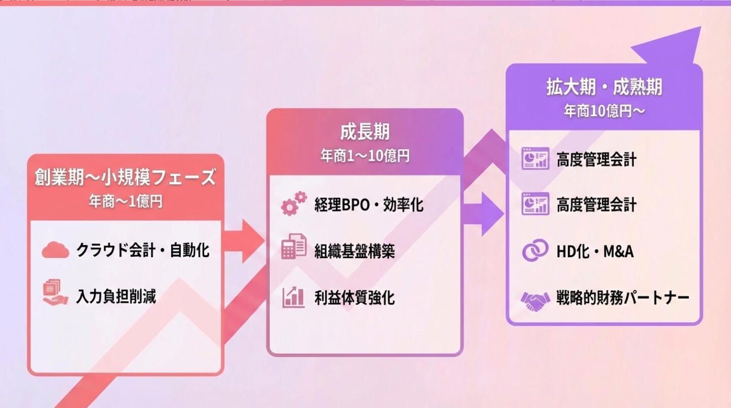 - 🌳拡大期・成熟期(年商10億円〜): より高度な管理会計や、ホールディングス化、M&A対応など、ハイレベルな専門家をパートナーに迎え、攻めの財務戦略を実行しましょう。