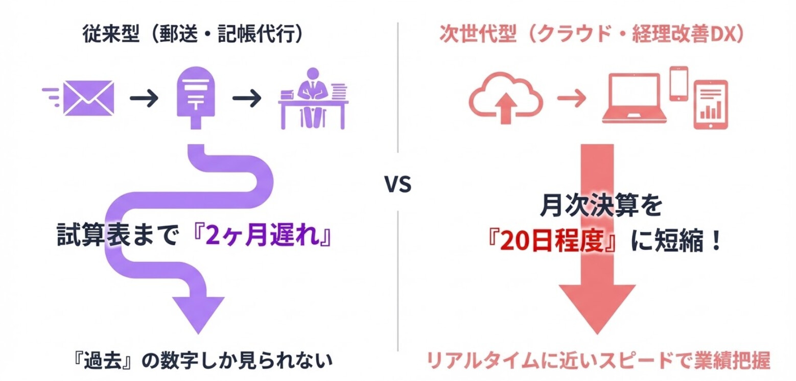 多くのケースで、資料を送ってから試算表ができるまで「2ヶ月遅れ」などが常態化しており、経営者は「今」の数字ではなく「過去」の数字しか見られない状態に陥ります。