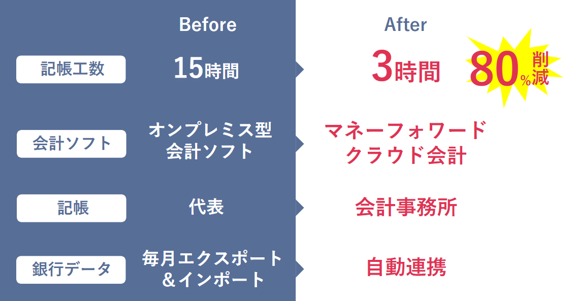 以前は社長自らが月間約30時間を経理業務に費やしていましたが、導入後は月間2〜3時間へと約90%以上の時間を削減することに成功しました。